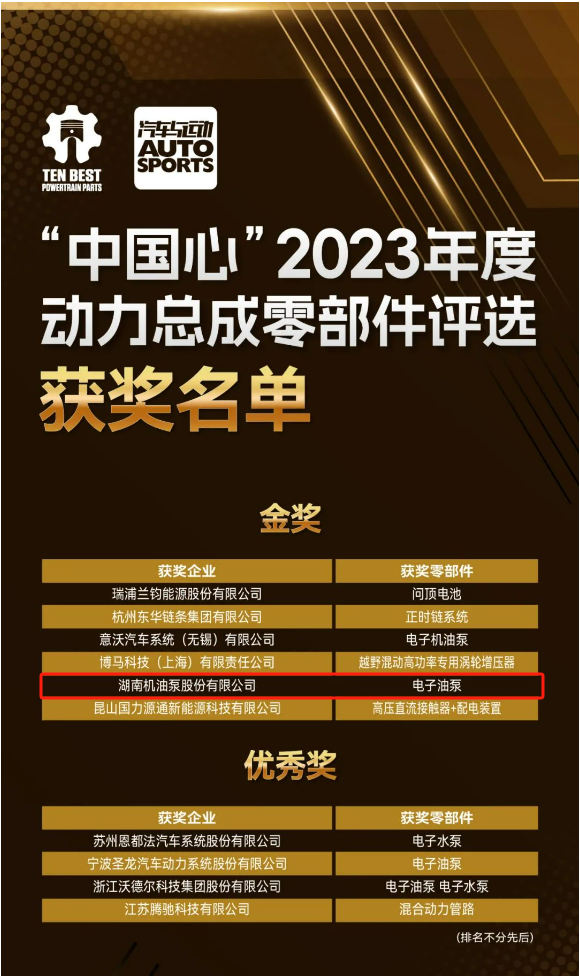 ?2023年11月8日 ,“中國心”2023年度動力總成零部件評選公布,湖南機油泵股份有限公司研發的電子油泵作為動力總成潤滑系統的“心臟”,榮獲了業界具影響力的金獎。這一殊榮不僅是對湖南機油泵不懈追求卓越品質和技術領先地位的認可,也標志著公司在全球動力總成領域的領跑者地位。
